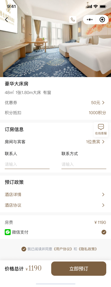 酒店预定微信小程序开发,酒店展示,根据预定时间筛选房间,价格,用户提交在线预定支付